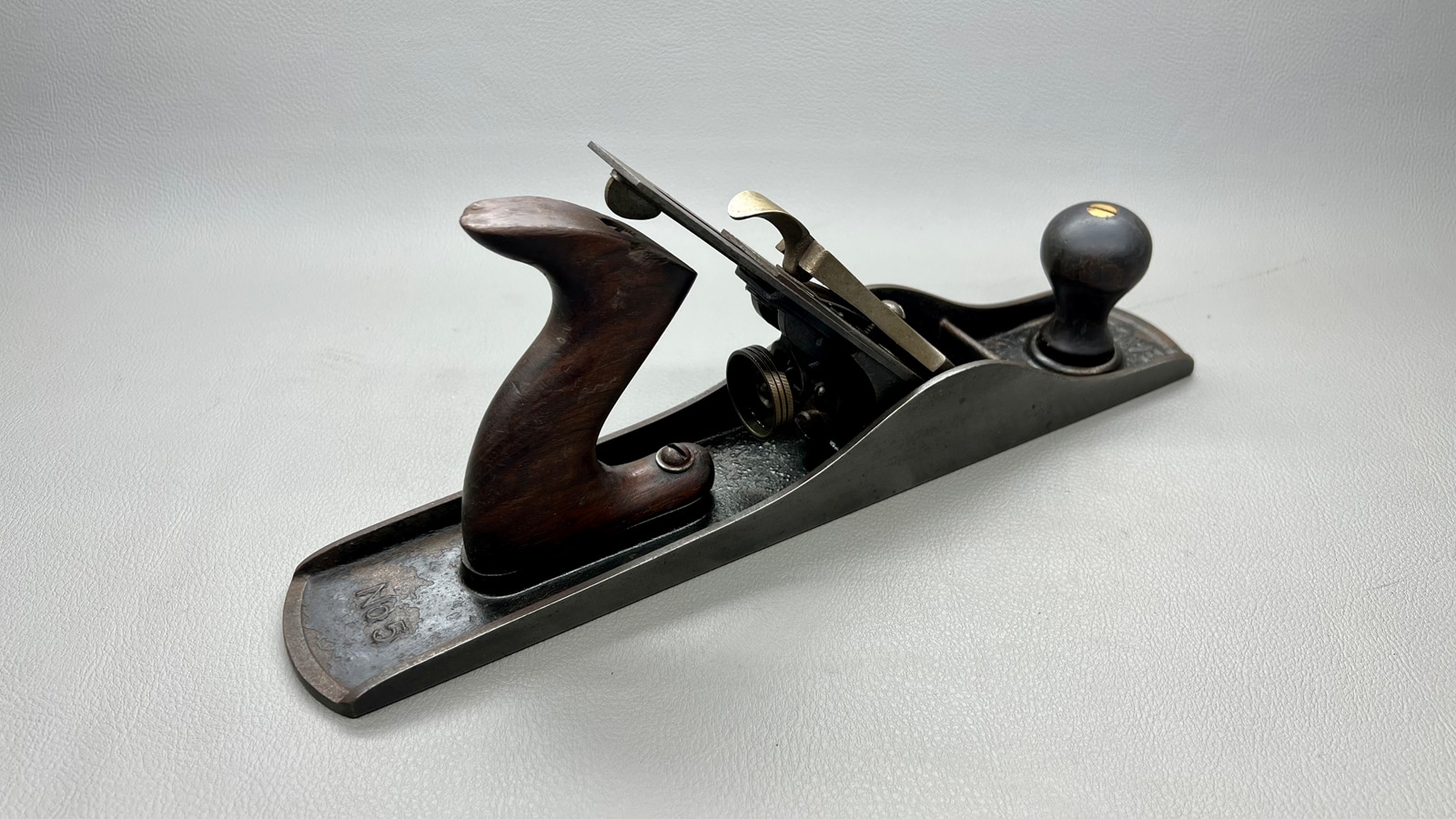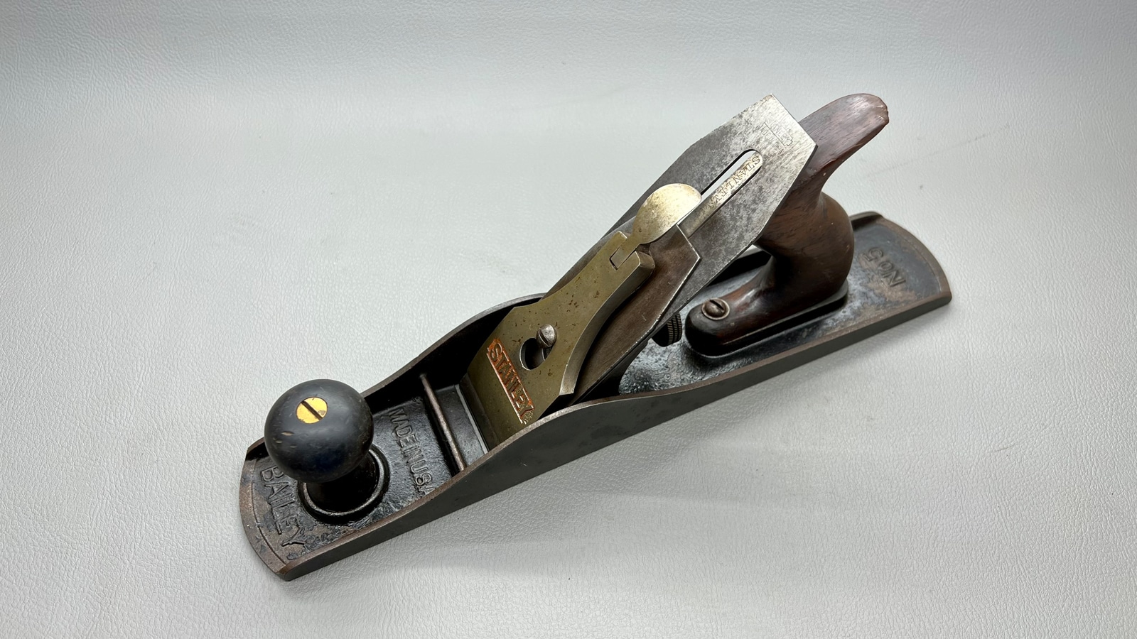 Stanley Bailey No 5 Bench Plane Made In USA which has a great Tote and Knob and is in Good Condition. Has a Full Cutter.